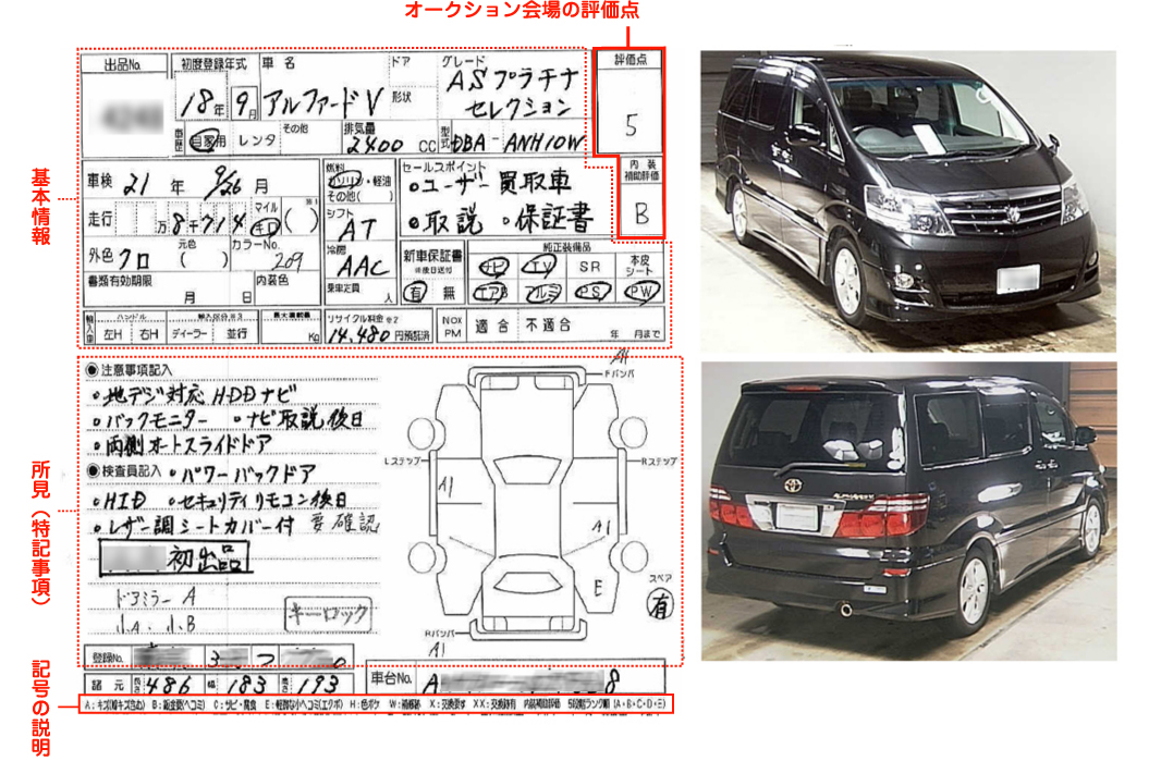 出品票には、走行距離、内装の状態、外装の状態から判断された『評価点』が記載されています。また、その評価の基となったキズや補修部分はどこか、その他装備などの特記事項が記載されています。出品票を見る上で、『修復歴(いわゆる事故車と言われるもの)』は特に重要で、当店では、購入のお客様には修復歴の有無を必ずお伝えしています。