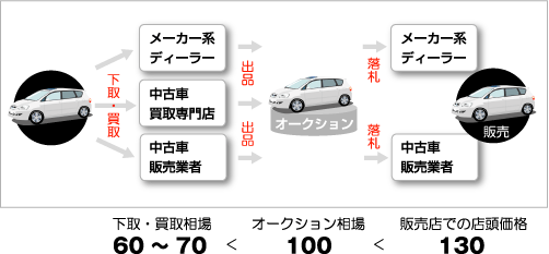 上の図は一般的な販売店での、各流段階での買取価格、販売価格を表したものです。買取専門店では、その時の『オークション落札相場』を参考に、買取を実施し、10日以内にオークションに出品する方法をとっています。その買取価格は落札相場の約6〜7割と言われています。
