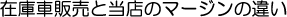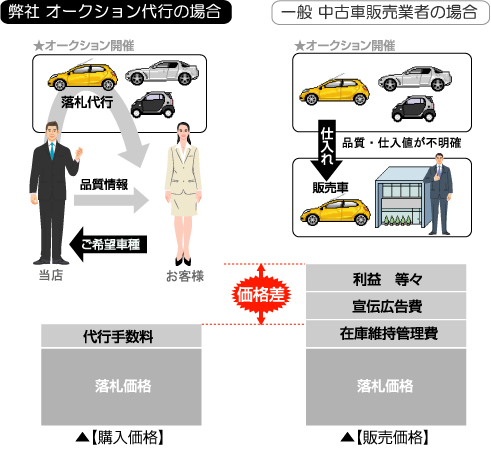 上記図は一般的な販売店と、オークション代行で購入される場合を比較したものです。在庫車があるお店とオークション代行では、店舗運営の維持費が大幅に違います。在庫のないオークション代行では、在庫車の維持費をカットできるため一般の販売店に比べ、安くお車を購入できます。